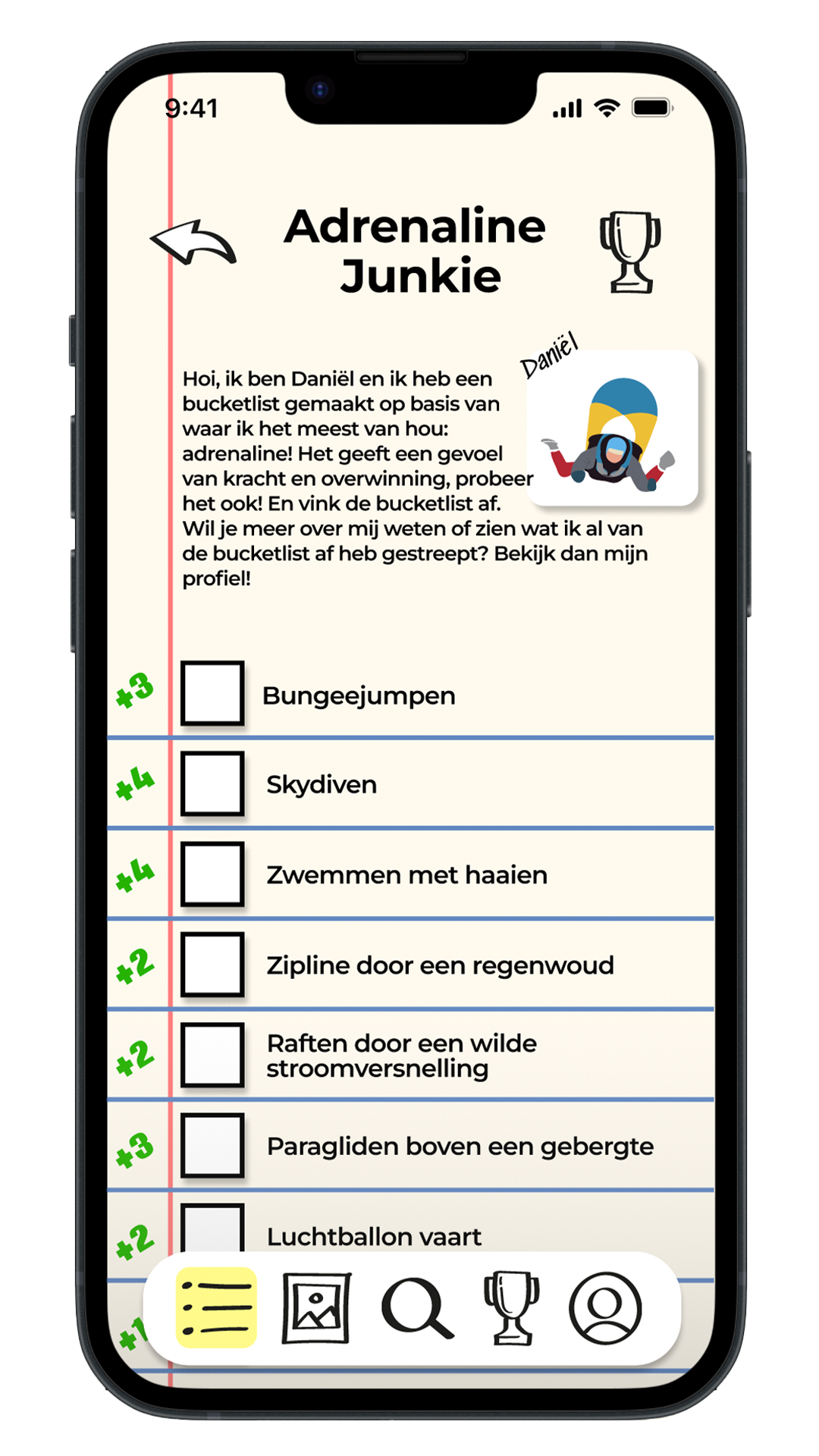 For my Communication and Multimedia Design (CMD) program, I designed an app with a fellow student based on our shared love for travel. The app, The ExploreList, is a bucket list app where users can create and complete goals in different categories with friends. Users can also share their achievements on a social feed to inspire each other.